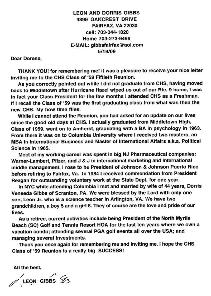 Leon was the class president of CHS 1959's Freshman year before moving to Middletown.