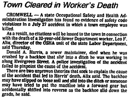 Donald Harris, 33, of Cromwell, died on July 27, 1983 as a result of a work accident on Evergreen Road in Cromwell.